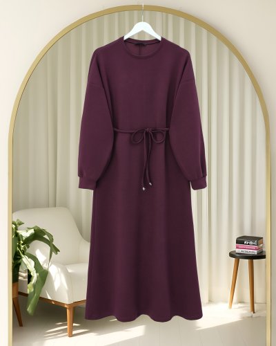Yuvarlak Yaka Kemerli Uzun Penye Elbise Mürdüm