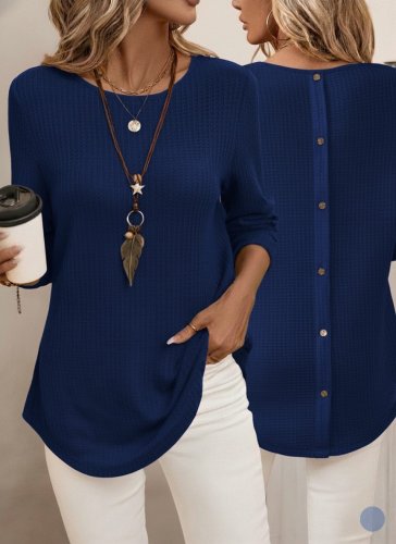 Kadın uzun kollu yuvarlak yaka arkadan düğmeli waffle bluz