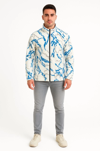 • Erkek Tam Fermuarlı Desenli Polar Sweat Lightning Desen Yakalı Uzun Kollu Oversize Rahat Kalıp Beyaz