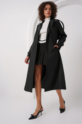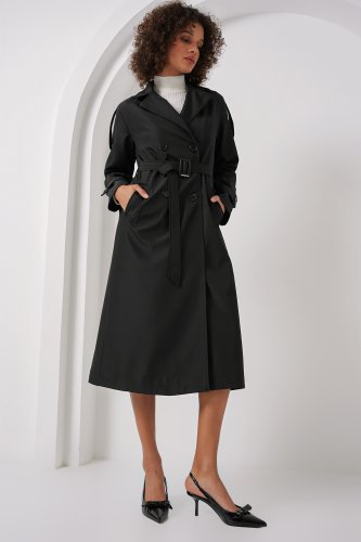 • 5941 Kruvaze Yaka Uzun Trençkot Siyah