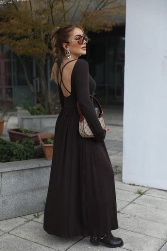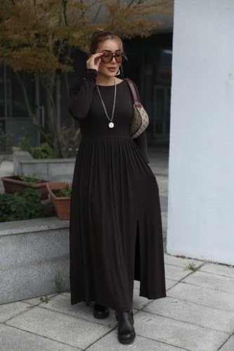 • Kadın kayık yaka sırt dekoltesi ve yırtmaç detay maxi boy elbise