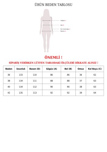 • Modelin Ölçüleri: Boy:165, Kilo:55, Göğüs:90, Bel:72, Kalça: 100