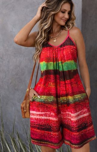 • Kadın ip askılı yuvarlak yakalı cepli desenli kısa süprem tulum
