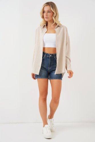 • Çizgili Oversize Gömlek 20293 Krem