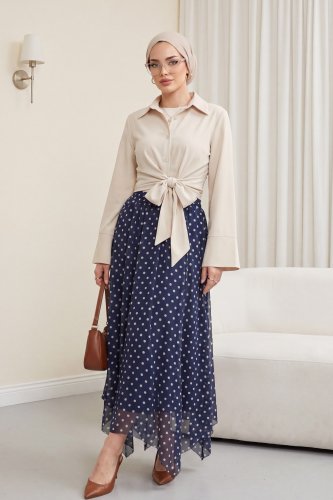 Beli Lastikli Asimetrik Kesim Parçalı Astarlı Şifon Etek Lacivert